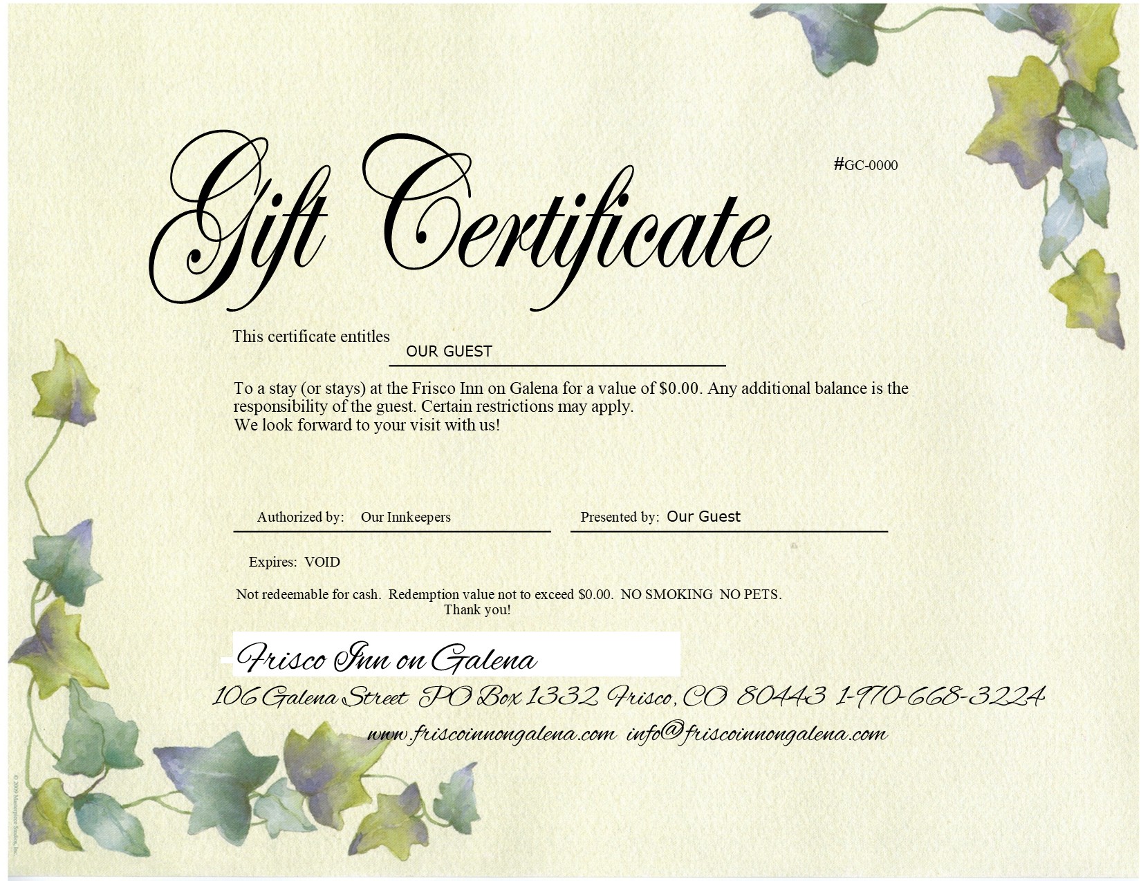 Purchase your Gift Certificate for the Frisco Inn on Galena here today!