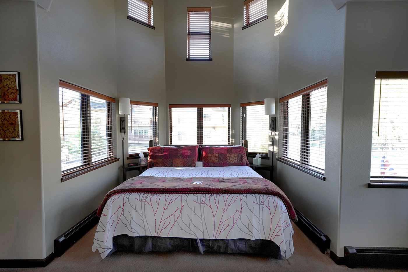 Wake up to brilliant Colorado skies in the King Tower Room, the largest and most distinctive guest room at the Frisco Inn on Galena in Frisco, Colorado. This stunning tower bedroom features a sumptuous king bed set beneath a dramatic two-story turret, with abundant windows offering sweeping 180-degree views of Frisco’s mountain peaks and iconic Colorado blue skies.