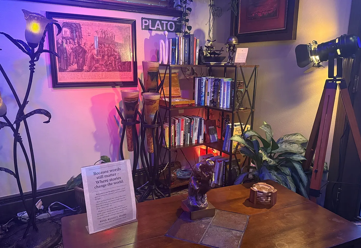 In the southwest corner of our dining room, something quietly radical is taking root. We call it Plato’s Corner, a cozy, curated space designed for reflection, inquiry, and a gentle rebellion against the noise of modern life.