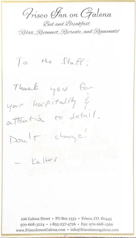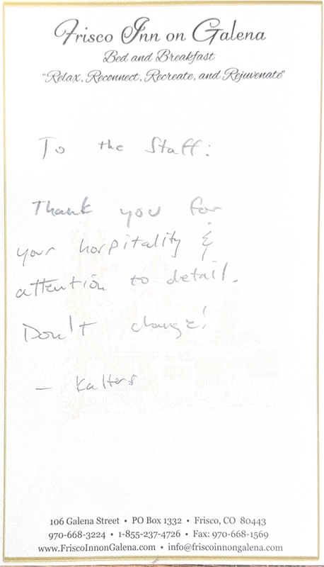 We are honored that our guests consistently choose Frisco Inn on Galena for boutique lodging in Frisco. Our guest reviews reflect the experiences that define our inn — warm hospitality, thoughtful service, relaxing amenities, and a central location in the heart of Summit County.